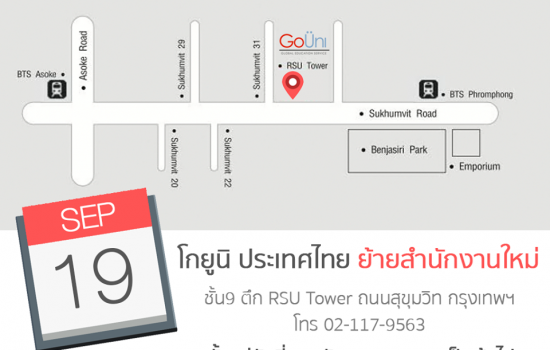 - สามารถสมัครด้วยตัวเองที่ GoUni Thailand Office : เลขที่ 410/37 ซ.รัชดาภิเษก 24 (BTS รัชดาภิเษก ทางออก4) ถ.รัชดาภิเษก แขวงสามเสนนอก เขตห้วยขวาง กรุงเทพฯ หรือผ่านทางเว็บไซต์ http://www.gouni.co.th/